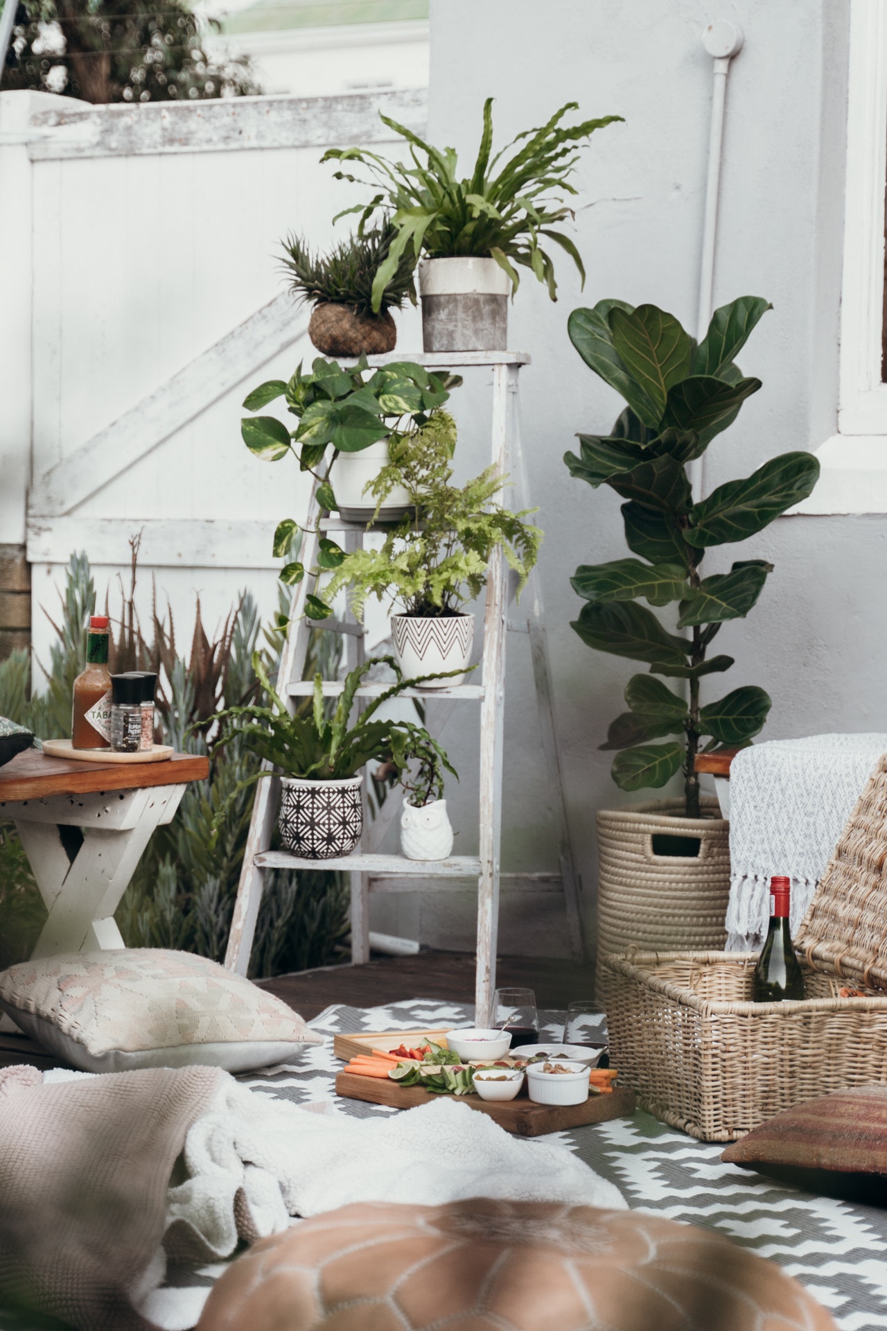 Algunos de los elementos decorativos que puedes utilizar para tu terraza son jarrones, cuadros, estanterías, botellas, colgantes, y por supuesto, plantas.
